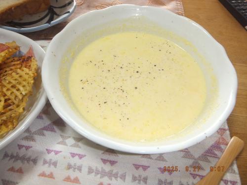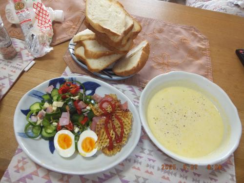 自家栽培野菜→ジャガイモ キュウリ ピーマン ロロンカボチャ いつものサラダにパンプキンスープを付け加えました!