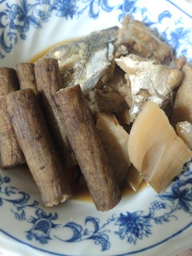 魚の煮付けには根菜を入れるといいですよ〜 根菜の土臭さが魚の臭味を取ってくれます 甘辛く煮た根菜は、飯と酒によく合います
