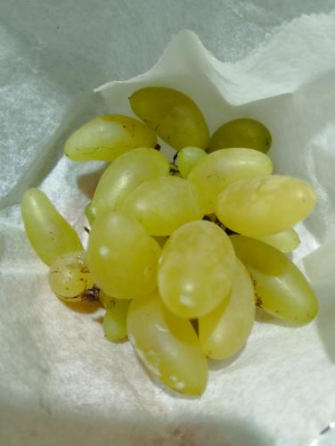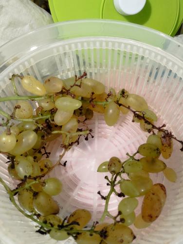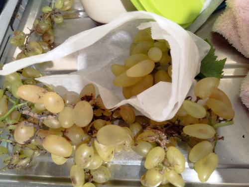 ほぼ最後の収穫。5房取った。まだ2、3房残ってるが粒がだいぶ汚くなってるので放置している。オーブンペーパーで囲っていたやつは割ときれいかなと思う。