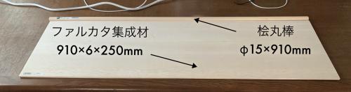 ちなみに使用した材料は、丸棒(桧丸棒φ15×910mm)と板材(ファルカタ集成材910×6×250mm)、ネジ(トラスタッピングM4×20mm)、取手で材料費は2000円程度。