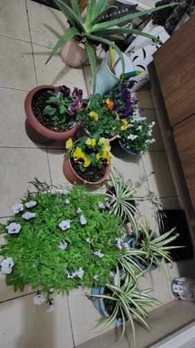 雪が舞う 吹雪いてる 真っ白に雪をかぶったパンジーとオリヅルランを玄関に入れた。 夏は暑すぎて まったく咲かなかったサフィニアが10月になって咲き始めた。 季節はずれのサフィニアも玄関に入れた。
