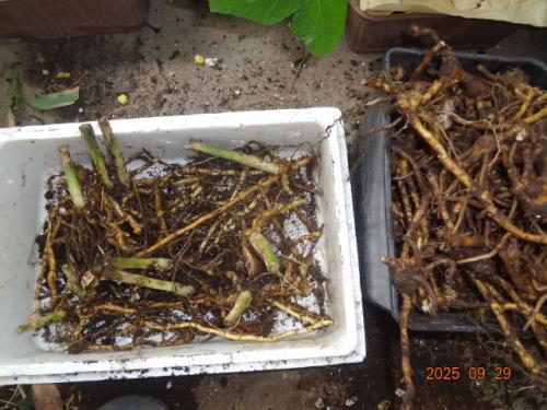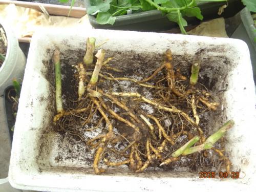 ミョウガ、株を縮小しました。発泡スチロール4箱を広い1箱に縮小しました。3分の1の根塊を残し、土中の花芽を7個回収。