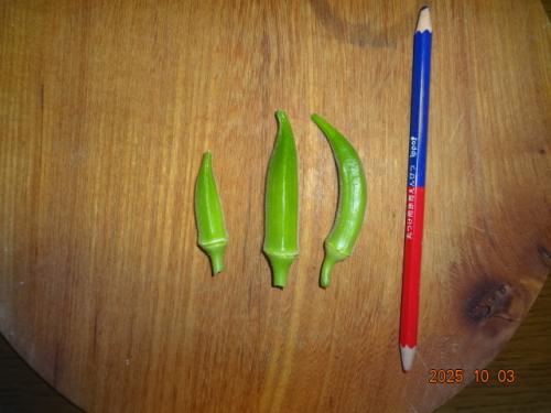 オクラ日記、3個収穫、累計95個。1輪開花。