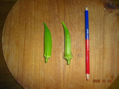 オクラ日記、2個収穫、累計97個。4輪開花。