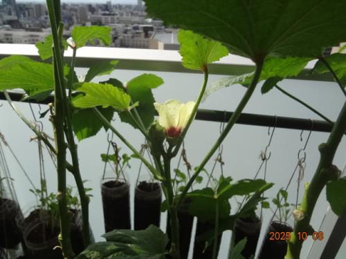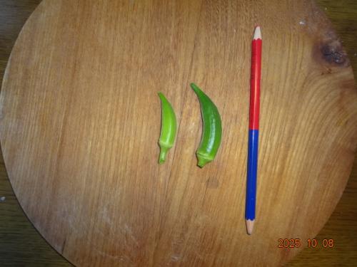 オクラ日記、2個収穫、累計105個。2輪開花。
