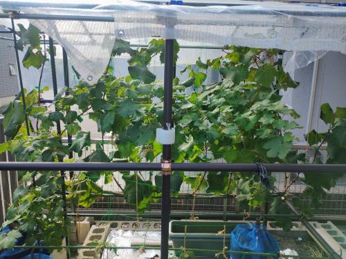 ナガノPに褐斑病が出たため、スカシバ対策も兼ねて薬剤散布。スミチオン、ダニ太郎、サンボルドー、ダインの混溶液をナガノP、紅伊豆、シャイン、マスカサーティーンに散布しました。