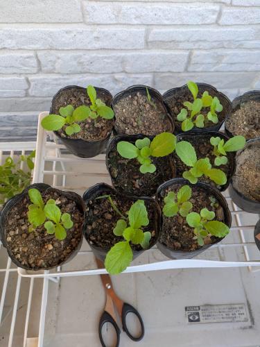 種まいて2週間で発芽率は…2/3くらいでしょうか?全く発芽してないポットはなし 古い種なので充分。 本葉が2枚、調子いいのなら3枚目が出てきたところなので二株残しに間引きした。 来週くらいかな?植え付け…の前に畝作れてない…