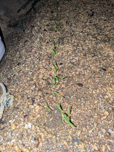 暗くてよく見えなくて、スマホの明かりだけが頼りです…むしろスマホごしの方がよく見えるw 発芽が進んで条まきした感じになってきた。 ただ1列あんまり発芽してない…アスパラの影が強すぎるんかな?