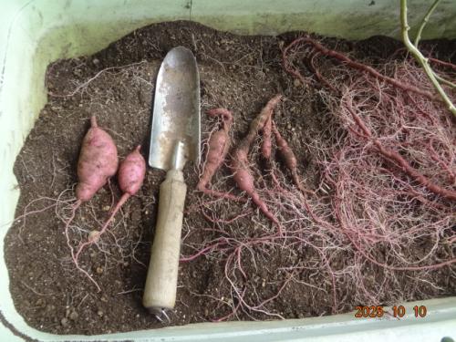 紅はるか、定植89日目、収穫しました。1個だけ大きめですが、ほぼひも状でした。しばらく冷暗所に置いておきます。