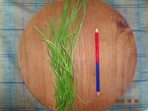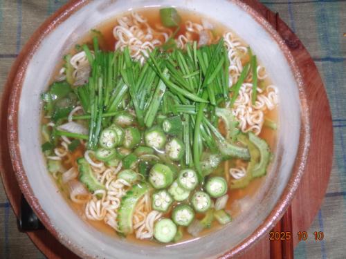 大葉ニラ、収穫しました。昼、オクラ、ゴーヤとニラのラーメントッピング。
