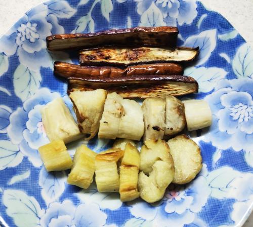 で、昨日収穫した佐土原と変な形のトルコを、丸ごと魚グリルで焼きナスにして食べました。