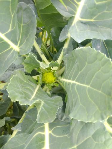栽培していますブロッコリーのうちの1株に待望の頂花蕾を発見、まだ1cmくらいです。