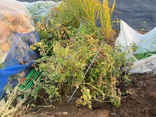 10月の長雨で病気のためか早々と枯れ込み始め、芋の成長も期待できなくなったので、撤収しました。 全体的に小粒でしたが、グランドペチカはとても美味しかったです。