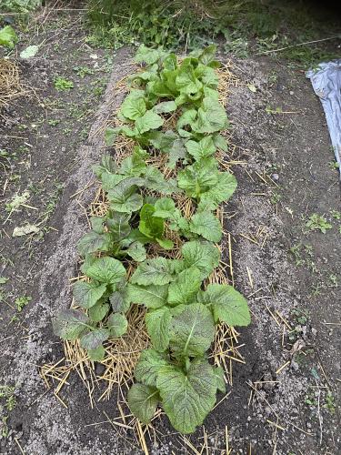 トンネル撤去して間引き、化成888を散布して土寄せしました。 切り藁マルチしました。