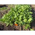 15cm間隔4列で約20行で直径8cm位の穴をあけ、5粒/穴で種まき。