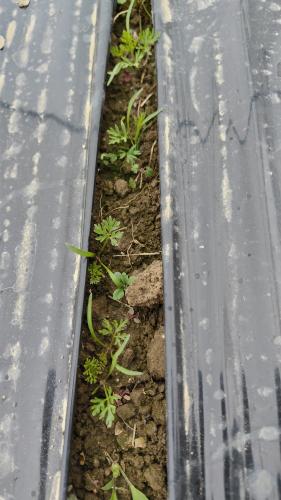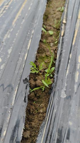 発芽が悪く、寂しい出来ですが、なんと、新たに芽が出てきてます。雨の影響なのか、環境が整ったのか、わずかですが発芽してます。なんとなく、以前よりも見られる畝になりそうな感じです。