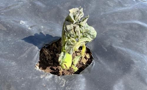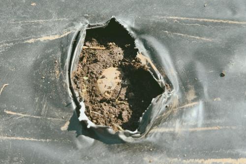 他のジャガイモはどれも発芽しないのに、ピルカは発芽。芽の周囲のマルチを非広げる。発芽しないジャガイモはどうやらジャガイモの表面が土から顔を出しているので土中温度が上がらないのかもしれない。