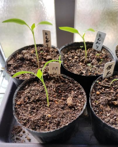 とんがりパワー2株とスイートパレルモに本葉が出ました。 発芽しているのほこの3株のみ。 こどもピーマンは発芽しなかった。 2つ追加で根出ししている。
