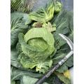 ![]() | 玉が肥大化し、手で押して硬くなっていたら収穫します。 葉の外側を広げ、株元をハサミや包丁などで切りとります。キャベツの茎は頑丈でハサミで収穫する場合にもかなりの力が必要です。 ハサミ等での収穫が困難な場合は、キャベツ用の収穫鎌というものもあるので使ってみると良いでしょう。 |