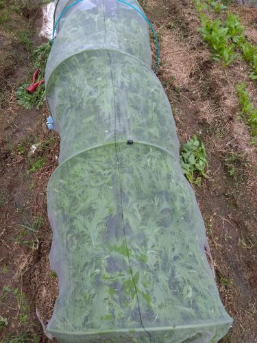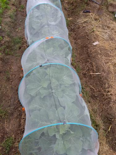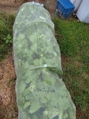 防虫ネットをしていても穴だらけ。オンブバッタに食べられなければ良いの考え、あいつらはガツガツ食いやがる。 天気が良くなればゼンターリを散布しよう。