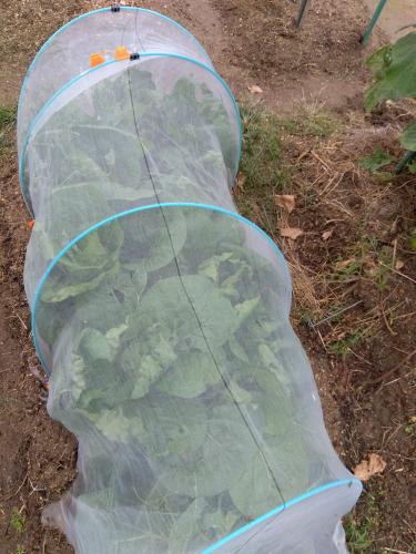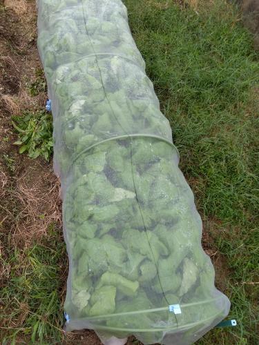 防虫ネットを上げてチラ見 イイ感じの葉っぱが立ち上がって丸まっています 虫食いもほぼ無く美人な白菜ですwww 害虫に注意して見守ります