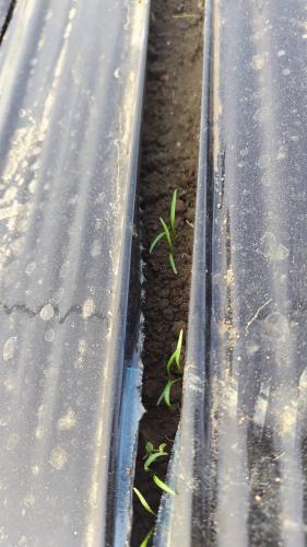 さすがに、温度が足らないみたい。 ビニトンにしないと無理っぽい。 マルチに不織布のべた掛け、不織布とビニルの二重トンネルじゃないと、発芽が難しいみたい。