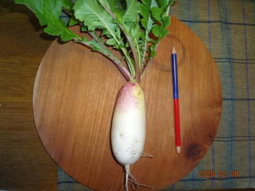 小太りくん、播種74日目、1個収穫。前回より長いです。累計3個、葉は刻んでラーメンでいただきました。大根おろしにちょうど良い大きさです。