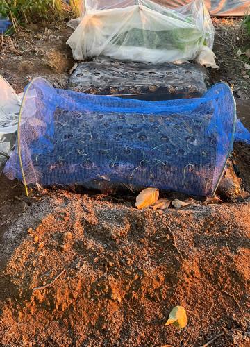 根付いたかどうか分からぬうちに霜が来てしまった。 マルチの中にも霜柱があり、小さな苗が耐えられるのか不安ですね。 今さらですが、株元に籾殻を敷きました。