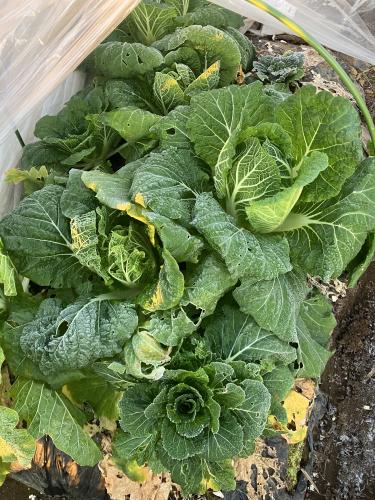 今朝の寒さで霜がおり、キャベツも真っ白になっていました。 もう少ししっかり保温しないと厳しそう。