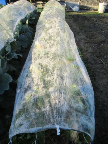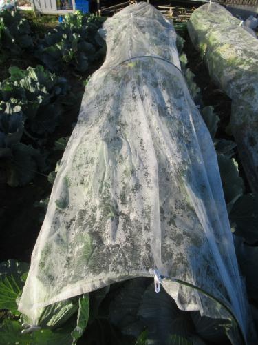 霜が降りるようになったので不織布を掛けました。 キャベツにも霜が付いています。