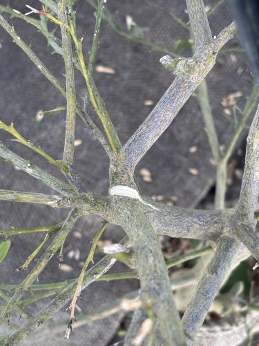 朝の見回りで発見しました。 フィンガーライムのピンクアイス、雪の重みで枝の付け根が裂けていました。 明日は対策しなきゃ。