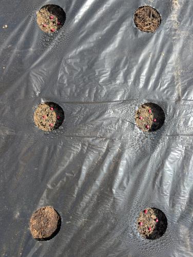 植え穴をビンの蓋で軽く凹ませ 4粒ずつ播種 メネデール希釈水を霧吹きし コート種子を湿らせたあと 覆土して再度メネデール水 最後にもみ殻でカバー