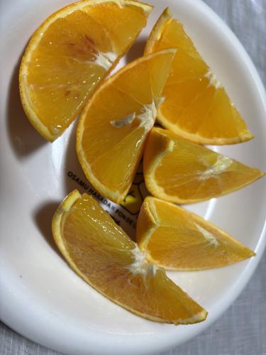 畑のブラッドオレンジ、先月中旬に収穫して 段ボールに入れ室内に保管しております。 あちこちにお裾分けし、残りは独り占めです。 毎日楽しんでいますが、今朝カットしたら少し赤くなっていました...