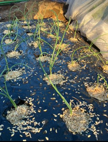 畑に霜が降り霜柱が出ていた非常に寒い朝ですが、ようやく定植できました。 植え付け後にマルチ穴へ籾殻を入れました。 また、霜対策で保温ビニールを上に被せています。