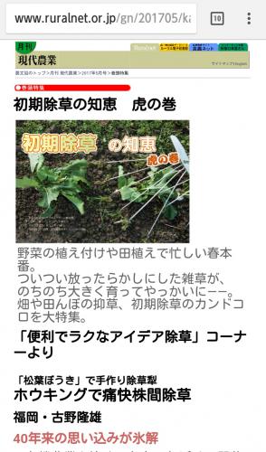 朝日新聞のサイトでホウキングなるものの記事を発見~♪ 現代農業にも掲載されていたみたいだけど、株間の雑草(生え始めのもの)をホウキングなる道具で撫でていくだけで、除草できてしまうという、除草作業嫌いのどらちゃんには夢のような道具じゃわ~♪ Youtubeでも動画があるので『ホウキング』で検索ね~♪ 980円で売ってるという情報も~♪ 探さなきゃっ(^-^)v PNで使ってみた人居るかな~? .