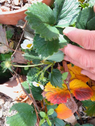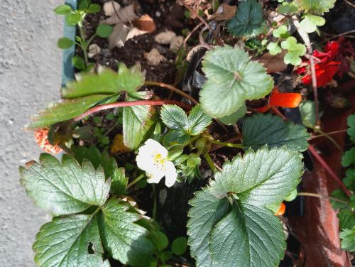 冬でも咲く良いイチゴ。でも、寒さや陽当たりのせいで、ちゃんとした実にはならないと思う。