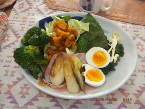 自家栽培野菜→下仁田ネギ ホウレンソウ ロロンカボチャ ブロッコリー ミニキャベツ ロメインレタス 下仁田ネギをコンソメで焼き上げて洋風にしてみました!