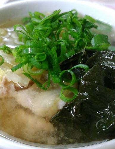 今日の朝食 自家製野菜の豚汁 黒いのはワカメじゃなく黒キャベツ「カーボロネロ」だよ カーボロネロは煮ても美味いね~
