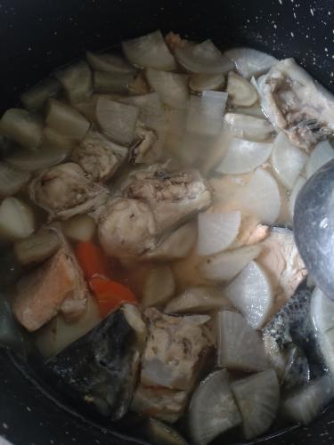 サーモンのアラは三平汁風にした