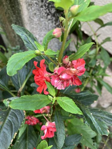 相変わらず咲いてくれるホウセンカ。もう日陰となる時間がだいぶ長くなってる。茎はかなり曲がってしまった。