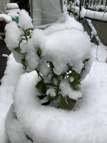 雪が降るとは言ってたものの、積もるほどには降らないだろうと信じてました。 朝起きてビックリ!積もってら…… 一昨日にオカワカメを伐採。ここ何年か茂ったまま越冬していたのが今年は葉が真っ黒く枯れてしまったし、雪が積もっても不思議はないか? でも、いまだに紫蘇は雪を乗せて青々としています。 早く春にならないかなぁ!