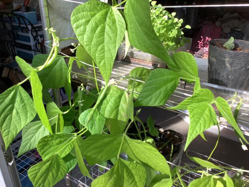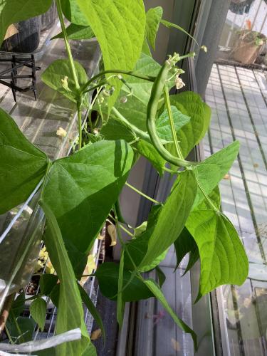 順調に花が咲き、散って鞘が付きました。 金時豆の大きさの鞘になってくれるのか心配な大きさです。 いまのところ普通のインゲン豆サイズ。 栽培している部屋は晴れていればポカポカですが、曇りだとチョイ寒。でも寒風は受けないので大丈夫そうです。