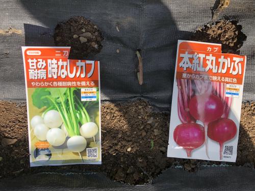 過去の履歴を見ているとこの時期に蒔いた 種は全て害虫被害で全滅、笑。今回はうまくいくといいけど。 いつもの赤蕪以外にサカタの二刀追加しています。