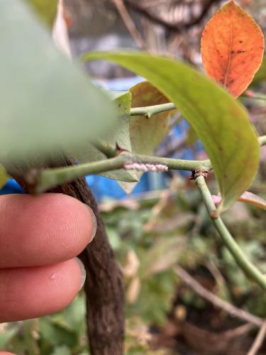 タイトルのものを細い枝にみつけた(写真一枚目)。よく見たら三箇所あった。 とりあえず爪でかいて落としたが、どうせ中に侵入してると見たので、火(キャンプファイヤーなどで使う、ブタンガスを燃料とするトーチを利用。強い炎が出る)で炙った。この時季、発火したらたいへんなので植物には滅多に使わないが、効果のほどを見たかった。わたみたいな部分は真っ黒になった(写真ニ枚目)。が、幼虫は果たして死滅したのか。怪しい。