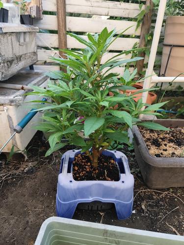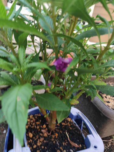 瀕死から復活した、ホウセンカがまだうちにあります。 紫の花が咲きました。 八重咲きのホウセンカです。