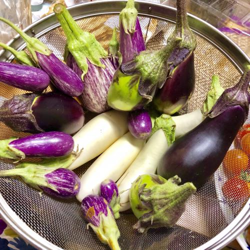 プランターナスとトマトを朝イチで収穫。 お盆の前半に出かけた時、水切れで枯れる寸前でしたが、夜中に水やりし、さらに台風の雨が降り復活しました。良かったわあ。 昨日からは普通に水やりしてます。今朝は液肥入りのみ水やり。 ナス色々とミニトマト色々。 今年は梅雨明けしてからは雨が少ないからか、トマトの出来がいいです。
