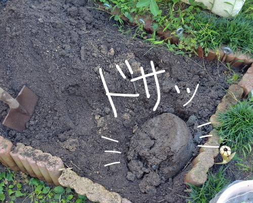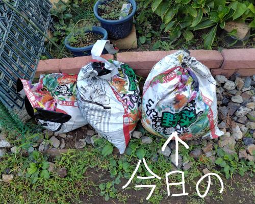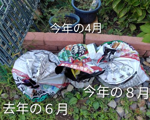 去年の6月に雑草を詰めた袋を開けてみたら、すっかり土になっていたので キュウリを抜いた土にドサッと混ぜた。 今日も最近2ヶ月くらい抜いてためておいた雑草を袋に詰めて、シャベル一杯土を入れ、骨粉油かすを上からふりかけて足で踏んだ。 1年後に開けてみよう。