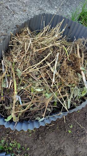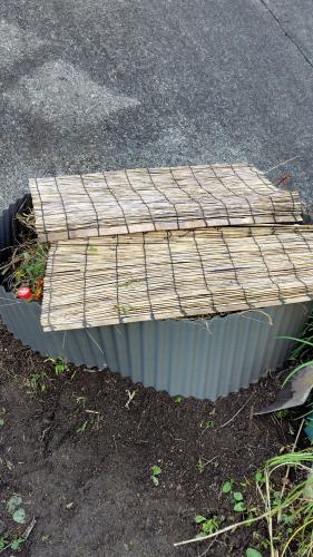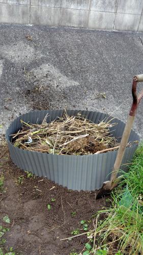 オクラやトマトやナスの抜いた葉や茎を 囲って、上によしずを乗せた。 ナメクジやダンゴムシが大量に繁殖するだろうから、トラップをたくさん設置した。 下の方が腐葉土になったら土に混ぜたい。