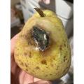 冷蔵庫から出して10日ほど経ったので、二つ目のラフランスを食べてみた。これは誤って落としてしまったばかりに、果皮に傷がつき、そこから急速に熟したもの。意外に傷は広範には至らなかった。