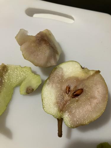 傷がついて先に熟してるところがあったもので、その影響を受けてもう食べられると思っていた。が、これはダメだった。うかつなことをした。柔らかくなってるところ以外は、味がない、固いだけの洋なしだった。真面目に追熟させるべきと知った。